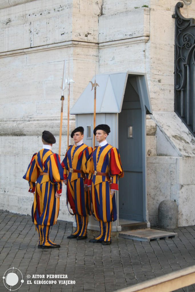 Uno de los instantes más fotografiados en la plaza es el cambio de la Guardia Suiza, el «ejército» del Vaticano, que podemos ver a la izquierda de la entrada principal de la basílica.