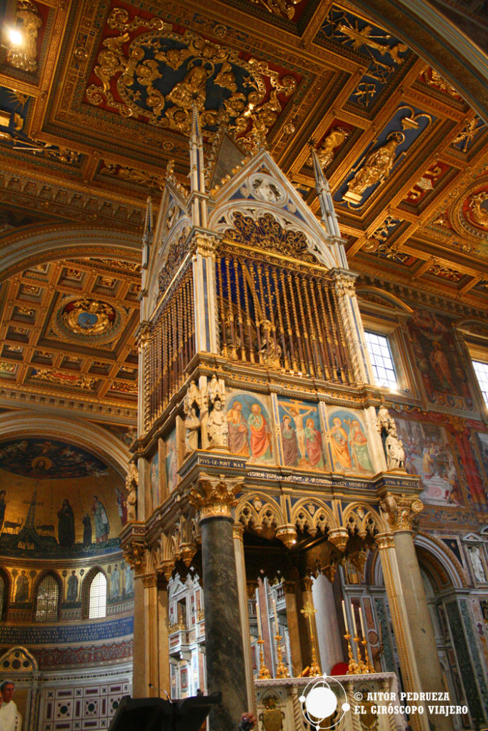 El baldaquino fue colocado en el año 1367 bajo el Papado de Urbano V, sobre el altar papal, y la leyenda cuenta que tiene reliquias de las cabezas de los apóstoles San Pedro y San Pablo. Al fondo a la derecha se encuentra la Puerta Santa, siempre cerrada salvo durante el Año Santo.