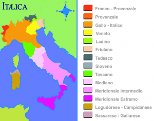 Consideremos el italiano moderno como una mezcla de dos grandes grupos dialectales bien marcados geograficamente en el norte (dialectos piamontés, milanés…) y los dialectos del centro y del sur (laziale, cicolano-reatino). Cada uno de ellos tiene varios sub-dialectos, en ocasiones uno por ciudad. La excepción es el sardo, un dialecto diferente al italiano estándar que se considera inlcuso una lengua diferente.