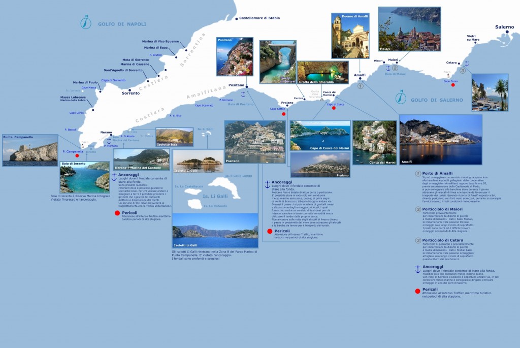 Algunas de las ciudades más interesantes para la visita de la Costa de Amalfi son: Amalfi, Atrani, Cetara, Conca dei Marini, Furore, Maiori, Minori, Positano, Praiano, Ravello, Scala y Tramonti.