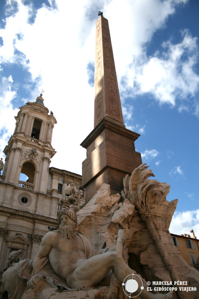 El primer monumento de Piazza Navona, de magnificente vistosidad, data de 1651 y es la «Fontana de Quattro Fiumi» (Fuente de los Cuatro Ríos), que en su muy ornamentada obra escultórica, Gian Lorenzo Bernini representó los cuatro continentes conocidos hasta entonces, haciendo alusión a los ríos correspondientes. De África El Nilo, de Asia El Ganges, de Europa El Danubio y finalmente de América El Río de la Plata. En el centro de la fuente se yergue monumentalmente el Obelisco de Domiciano, mismo que dicho emperador mandara a construir en Egipto. Cabe mencionar, que debajo de éste, Bernini dejó un hueco a posta, para dar la ilusión óptica de que se halla suspendido en el aire.